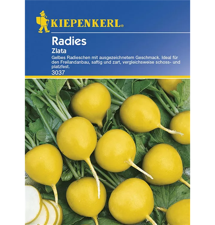 Gelbes Radies mit gutem Geschmack. Ideal für den Freilandanbau im Frühjahr und Herbst. Die appetitlichen Knollen sind rund, glattschalig und haben einen mildwürzigen Geschmack. Zlata ist vergleichsweise schoß- und platzfest.<br>