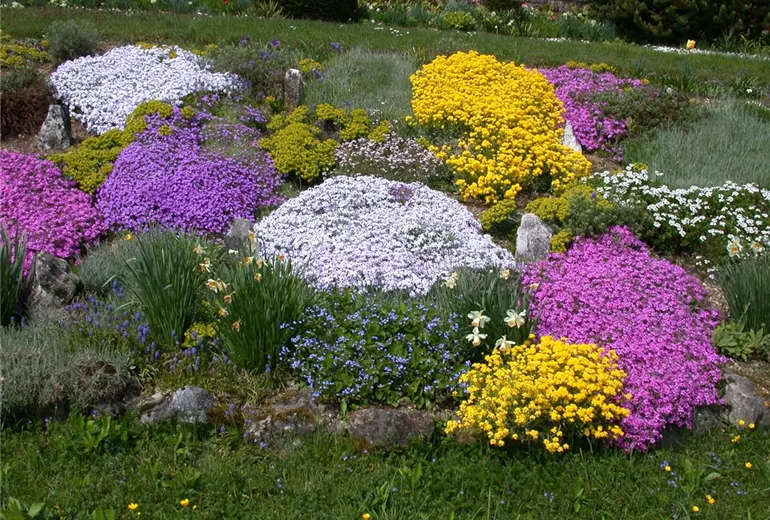 Besonders schön wird die Gartengestaltung, wenn verschiedene Bodendecker nebeneinander gepflanzt werden. Eine gute Kombination sind immergrüne Bodendecker wie Efeu und Dickmännchen zusammen mit Phlox, Ehrenpreis oder Storchschnabel. Bodendecker sind anders als Gehölze oder Stauden keine eigene botanische Pflanzengruppe. Als Bodendecker eignet sich, wer krautig wächst und den Boden flächendeckend begrünen kann. So gibt es auch unzählige Stauden, Gehölze und Ziergräser, die sich perfekt als Bodendecker eignen. Bei der Gestaltung mit Bodendeckern kommt es ganz auf den persönlichen Geschmack und die eigene Geduld an. Grundsätzlich werden 6-8 Pflanzen pro Quadratmeter Bodenfläche gepflanzt. Dadurch brauchen die Bodendecker nicht allzu lange, um die Fläche vollständig zu begrünen. Wer mehr Geduld hat, kann auch nur wenige Pflanzen setzen, muss dann aber in den ersten Jahren noch regelmäßig Unkraut zupfen und entfernen. Sind die Bodendecker erstmal gepflanzt, werden sie sich schnell ausbreiten und kahle und schattige Stellen im Garten mit Farbe füllen.